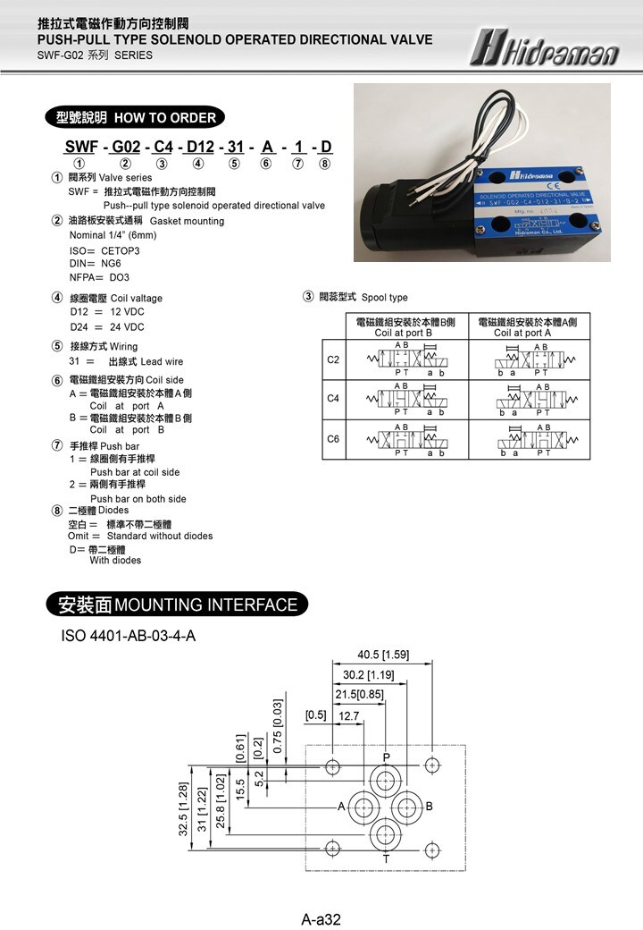 SWF=Push-pull type sokenoid operated directional valve